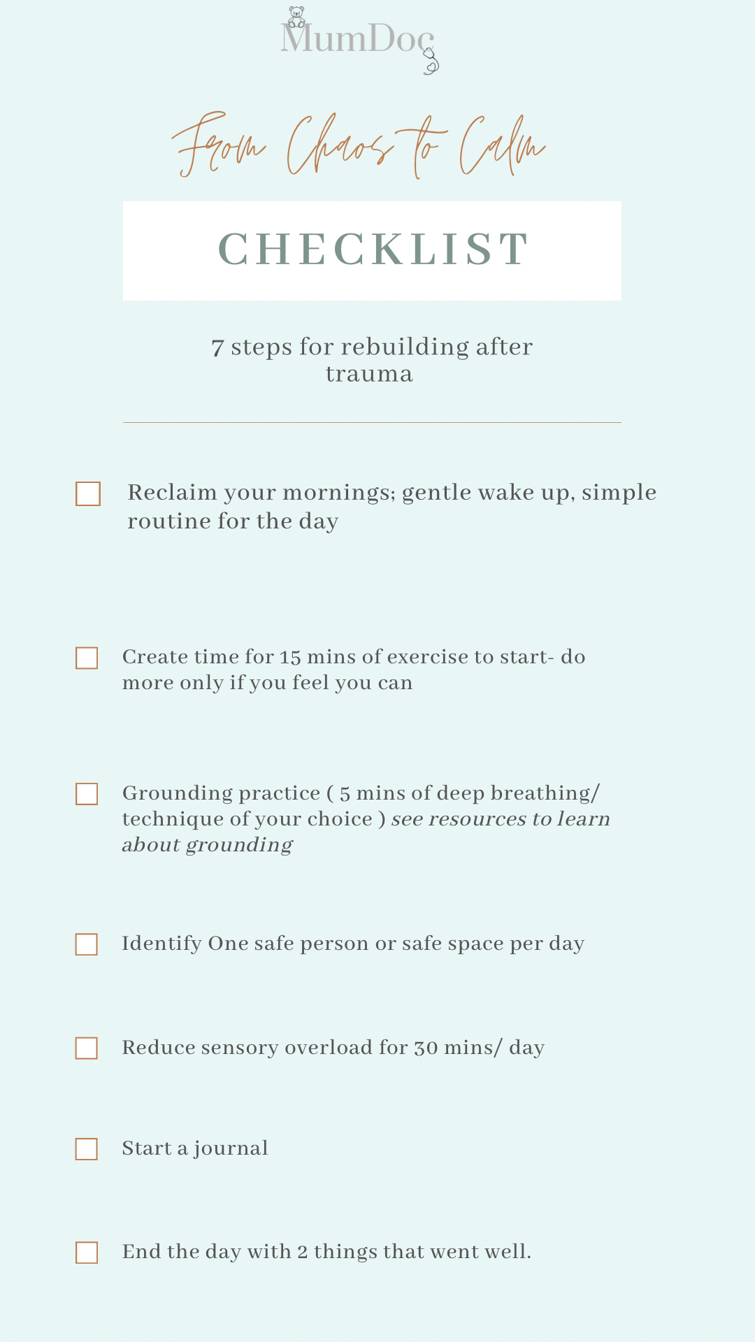 Checklists and encouragement for when you're struggling, to help bring you from a place of chaos to calm.